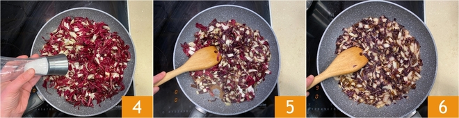 Ajuste o sal 4 e deixe evaporar 5. Continue cozinhando por mais 3-4 minutos até que o radicchio esteja macio 6.