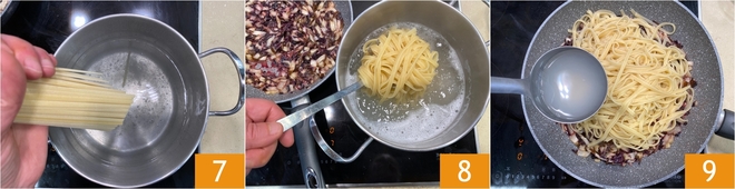 Cozinhe as linguine em água abundante com sal 7 e escorra quando estiverem al dente 8, reservando um pouco da água do cozimento. Transfira a massa para a panela com o radicchio e adicione uma concha de água do cozimento 9.