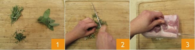 Para preparar o lombo de porco assado, a primeira coisa a fazer é pegar uma parte das ervas aromáticas: tomilho, alecrim e sálvia (reserve a parte restante) 1; pique as ervas grosseiramente em uma tábua de corte 2. Passe então ao lombo, coloque-o sempre na tábua de corte e, com uma faca de lâmina afiada, faça cortes na capa 3,