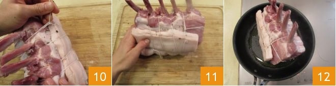 Assim que você passar o barbante em torno da última costela 10, faça uma laçada girando o barbante e segurando a base da mesma com os dedos. Enfie a mão na laçada e gire o fio algumas vezes, depois passe a carne por dentro e aperte para fazer o último nó 11. Quando a carne estiver bem amarrada, passe para a cocção. Aqueça um fio de azeite em uma panela antiaderente e, quando estiver quente, coloque o lombo dentro 12.