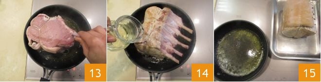 Doure bem, virando de todos os lados 13, mas sem furar, só assim você selará os poros da carne e os sucos permanecerão dentro. Quando estiver bem dourada, regue a carne com o vinho branco 14, que servirá para dar um tom ácido à carne de porco, naturalmente doce. Aguarde alguns instantes e, usando pinças, transfira a carne para uma assadeira, reservando o fundo de cocção 15.