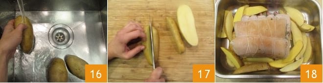 Nesse ponto, lave bem as batatas 16 e seque-as com um pano de prato. Em seguida, corte-as primeiro ao meio e depois em fatias, de preferência do mesmo tamanho 17. Coloque-as na assadeira 18 e adicione um pouco de sal nas batatas. Não será necessário adicionar óleo, pois o lombo tem essa capa que, durante o cozimento, irá derreter. Asse a 180° por cerca de 15 minutos.