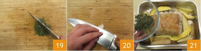 Enquanto isso, pegue as ervas aromáticas reservadas anteriormente e pique-as também 19; depois, amasse levemente um dente de alho com casca 20. Após 15 minutos, retire a carne do forno, adicione o dente de alho e as ervas aromáticas 21.