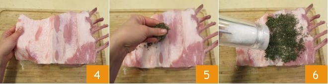 de modo a separá-la da carne, mas sem removê-la completamente. Em seguida, abra-a 4 e insira as ervas que você picou anteriormente dentro 5; depois tempere com sal 6 e pimenta.