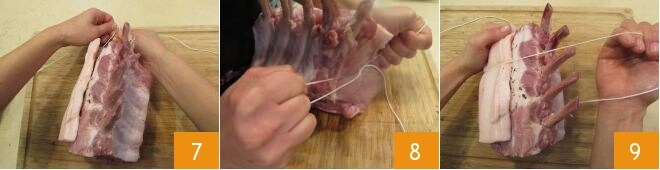 Feche a capa e prossiga amarrando o assado para mantê-lo junto e dar forma à sua carne. Com o barbante de cozinha, faça uma rede: passe o barbante primeiro por baixo 7 e depois por cima da carne, no sentido do comprimento, prendendo bem as pontas do fio na extremidade com um nó 8 e deixando uma parte do barbante um pouco mais longa. Agora use o barbante mais longo e volte pelo lado oposto, fazendo um último nó para prender o fio. Dessa forma, a capa ficará bem aderente ao pedaço de carne. Neste ponto, continue a criar sua rede, passando o fio entre as costelas 9.