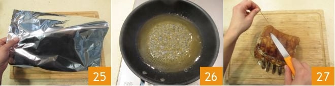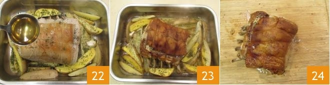 Despeje o caldo na assadeira, ao redor do pedaço de carne 22 e leve novamente ao forno a 180°: para saber o momento certo de parar o cozimento, é necessário usar um termômetro. A temperatura no centro da carne deve ser de 62-65°. Os tempos de cocção variam de acordo com o tamanho do pedaço de carne que você usou, levará cerca de 40-50 minutos. Retire a assadeira do forno 23 e transfira apenas a carne para uma tábua de corte 24.