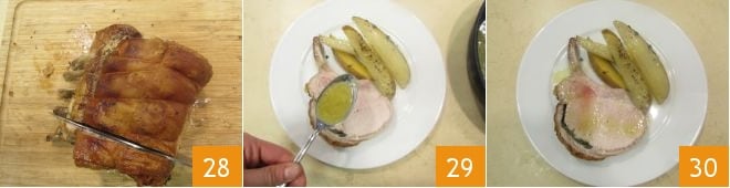 Corte-a em fatias, regulando-se de acordo com a posição dos ossos 28. Em seguida, transfira para um prato tanto a carne quanto as batatas e cubra com o fundo de cocção 29. O lombo de porco assado está pronto para servir 30!