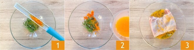 Para preparar o lombo com laranja, primeiro retire a casca e o suco de cerca de 1 kg de laranjas: você precisará de 10 g de casca e 450 g de suco. Prepare a marinada: coloque em uma tigela o alecrim, o tomilho, o louro, os grãos de pimenta e 2 colheres de sopa de óleo retiradas da quantidade total, depois adicione a casca ralada das laranjas 1 e metade do suco espremido 2. Adicione a carne na tigela, depois cubra com filme e deixe marinar na geladeira por pelo menos 3 horas 3. A cada 30 minutos, vire a carne na tigela para garantir que todos os lados estejam em contato com a marinada.