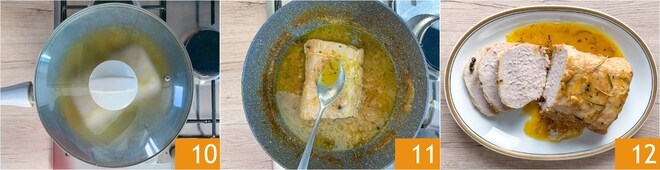 Cubra com a tampa e cozinhe por 3 horas em fogo médio-baixo 10, virando a carne de vez em quando e regando-a com o molho de cozimento 11. No final do cozimento, ajuste o sal. Na hora de servir, corte o lombo com laranja em fatias e regue com o molho de cozimento 12!