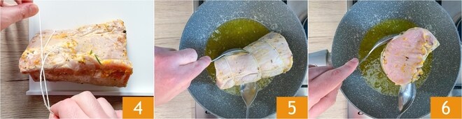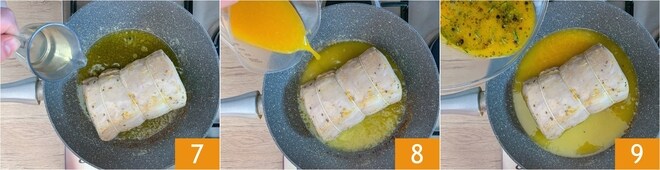 Depois de selar todos os lados, deglace com vinho branco 7 e deixe evaporar completamente, depois adicione o suco de laranja restante 8 e a marinada reservada 9.