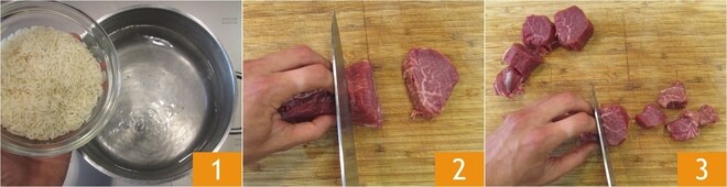 Para preparar o lomo saltado, primeiro leve uma panela de água salgada para ferver e cozinhe o arroz que será usado como acompanhamento 1. Enquanto o arroz cozinha, corte o filé de carne primeiro em fatias 2 e depois em pedaços grandes e regulares 3.