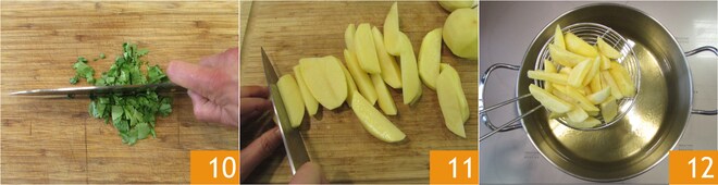Pique grosseiramente o coentro 10. Por fim, descasque e corte as batatas em fatias 11 e frite-as em óleo de sementes quente 12.
