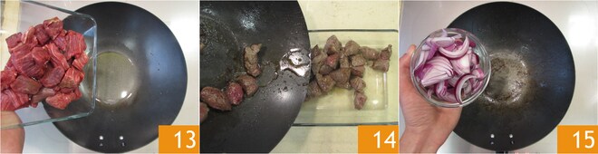 Em um wok, ou em uma frigideira antiaderente, doure a carne com um fio de óleo em fogo muito alto por cerca de 5 minutos para cozinhá-la rapidamente 13, depois reserve 14. Na mesma panela, adicione as cebolas 15.