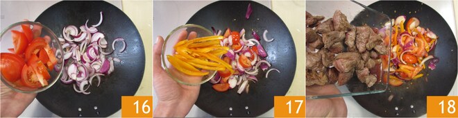 Adicione também o tomate 16 e o ají amarillo 17. Refogue tudo por alguns minutos, sempre em fogo alto, depois adicione a carne dourada 18.