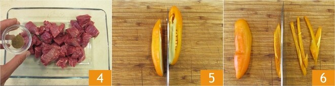 Transfira a carne para um recipiente, tempere com cominho 4 e uma pitada de sal e reserve enquanto prepara o restante dos ingredientes. Divida o ají amarillo ao meio no sentido do comprimento 5, retire as sementes internas e corte em tiras 6.