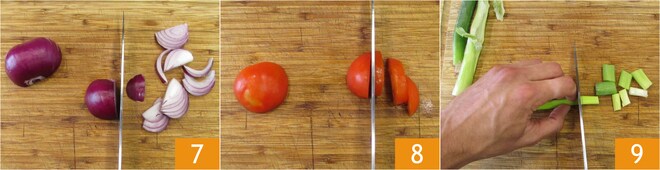 Descasque e corte a cebola em fatias grossas 7. Fatie também os tomates 8 e corte a parte verde da cebolinha em pedaços 9.