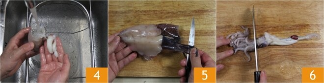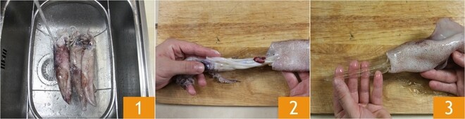 Para preparar as lulas grelhadas ao limão, primeiro cuide da limpeza das lulas: enxágue-as bem sob água corrente 1, depois com as mãos, destaque delicadamente o tentáculo do corpo e reserve-o 2. Remova a pena de cartilagem transparente do interior do corpo 3.