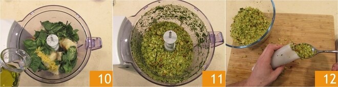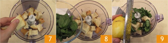 Agora você pode passar à preparação do recheio: corte o pão em cubos e coloque-o em um liquidificador com lâminas de aço 7, depois salgue, apimente e adicione as folhas de manjericão, que você já lavou e secou previamente 8. Adicione também a casca ralada do limão e o suco 9.