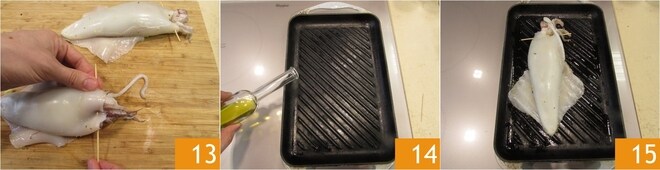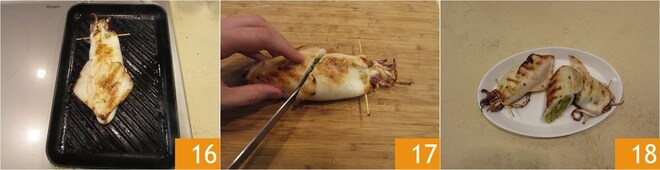 Neste ponto, pegue o tentáculo com os tentáculos que você tinha removido anteriormente, posicione-o na extremidade da lula e sele a abertura com um palito, espetando tanto as bordas da lula quanto o tentáculo com o palito; dessa forma, você fixará o tentáculo ao corpo da lula e evitará que o recheio escape 13. Aqueça bem uma grelha e unte-a com óleo 14, depois coloque as lulas recheadas de um lado e deixe-as cozinhar por cerca de 10-12 minutos em fogo médio 15.