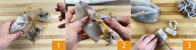 Para preparar as lulas com ervilhas, antes de tudo, limpe as lulas: enxágue-as sob água e separe a cabeça do manto, extraindo delicadamente as vísceras e a pena de cartilagem que se encontra no interior 1. Enxágue bem, por dentro e por fora, e remova a pele 2, incluindo o bico. Enxágue várias vezes e, finalmente, corte-as em rodelas de aproximadamente 2 cm de largura 3.