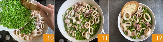 Nesse ponto, adicione as ervilhas 10, acrescente um fio de azeite e cozinhe por mais 10 minutos 11. Ajuste o sal, se necessário, e sirva as suas lulas com ervilhas acompanhadas de fatias de pão torrado 12!