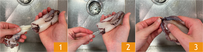 Para preparar as lulas gratinadas ao forno com tomatinhos e azeitonas, primeiro dedique-se à Como limpar lulas: separe os tentáculos do manto 1 e retire a pena de cartilagem que está dentro dele 2. Lave sob água corrente e use as mãos para remover as vísceras que estão no manto. Faça um pequeno corte com uma faca na parte final do manto e remova a pele externa 3.