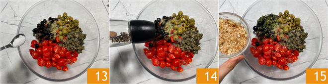 Adicione também as alcaparras dessalinizadas 10, o orégano seco 11 e a cebolinha seca 12.