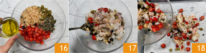 Neste ponto, polvilhe com a farinha de rosca restante 19 e os 10 g restantes de óleo 20. Asse em forno estático a 200°C por 10 minutos, depois mude para o modo ventilado, ainda a 200°C, por mais 15 minutos. Suas lulas gratinadas ao forno com tomatinhos e azeitonas estão prontas para serem servidas 21!