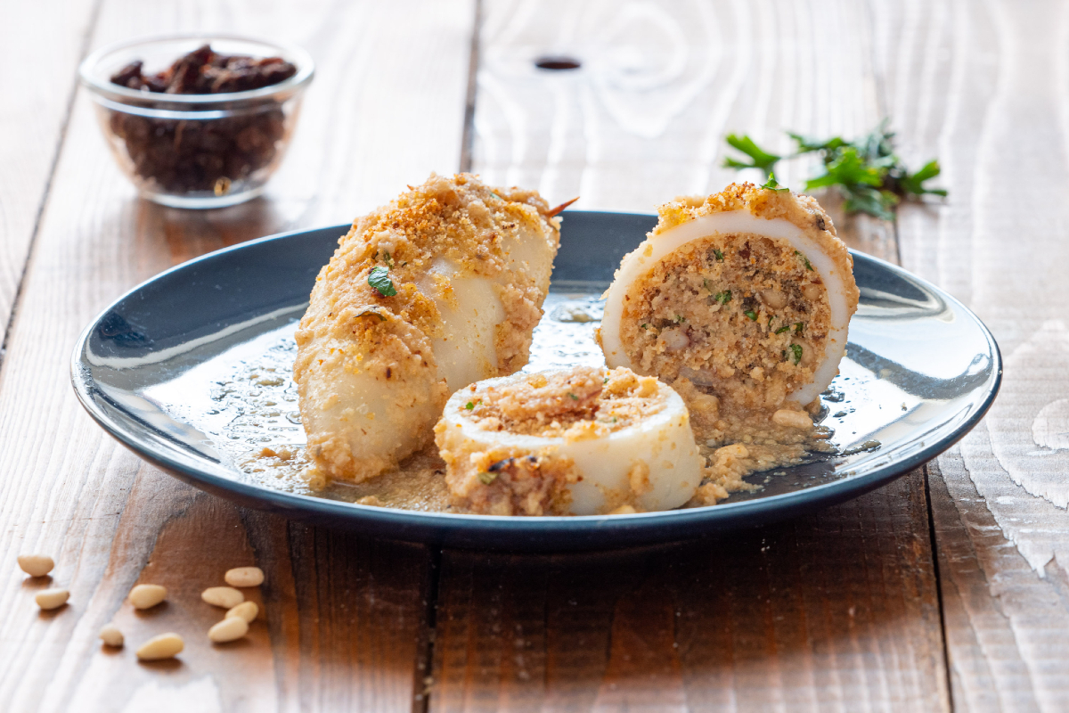 Se você é amante de lulas recheadas, com certeza vai adorar esta receita. As lulas recheadas ao forno são um prato principal à base de peixe realmente fácil de preparar e perfeito para todas as ocasiões! Para recheá-las hoje escolhemos um recheio "à siciliana" com ingredientes típicos do local, como pinoli, anchovas e uvas-passas. Este recheio vai deixar todos de boca aberta... graças à farinha de rosca e à adição de água, ele permanecerá macio e úmido, mesmo cozinhando as lulas no forno. E assim como na versão mais clássica, os tentáculos das lulas e as asas são acrescentados em pequenos pedaços ao recheio, para torná-lo super saboroso! Realizar as lulas recheadas ao forno é realmente simples, descubra como fazer com os nossos passos!