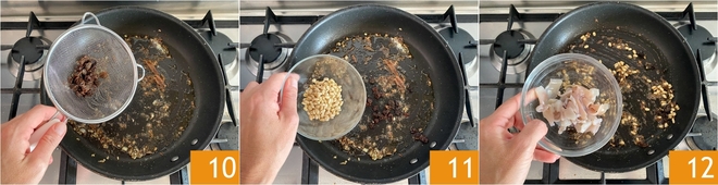Adicione também as uvas-passas escorridas 10 e os pinoli 11. Por fim, acrescente as lulas em pedacinhos 12 e deixe dourar por alguns minutos.