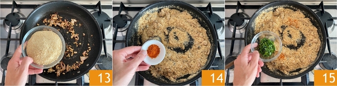 Desligue o fogo e adicione a farinha de rosca 13, depois tempere com sal, uma pitada de pimenta vermelha 14 e bastante salsa picada 15.
