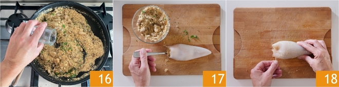 Despeje a água 16 e misture. Assim, o recheio ficará mais macio e úmido. Pegue os corpos das lulas e recheie com a mistura 17, depois prenda as extremidades usando palitos 18.