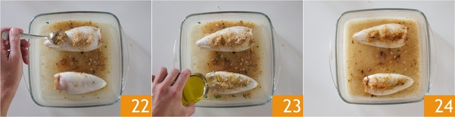 Coloque as lulas em uma assadeira, depois despeje o vinho branco 19 e um fio de azeite 20. Adicione um pouco do recheio restante por cima 21.