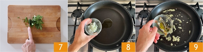 Pique também um maço de salsa 7 e reserve. Despeje um fio de azeite na frigideira, adicione a cebola picada 8 e deixe murchar. Junte as anchovas 9 e deixe-as derreter com o calor.