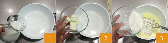 Para preparar os lumaconi com linguiça e scamorza, comece a preparar o Bechamel: esquente o leite em uma panela 1; à parte, derreta a manteiga em fogo baixo 2, depois desligue o fogo e adicione a farinha peneirada aos poucos 3, mexendo com um batedor.