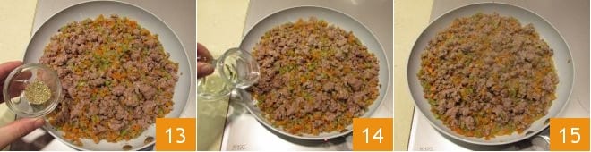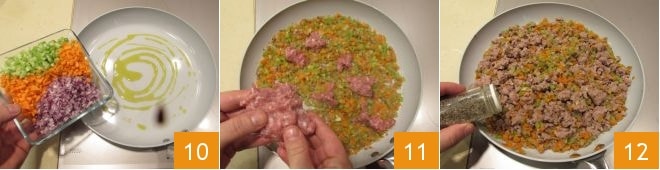 depois aqueça um fio de óleo na frigideira e adicione os legumes 10, deixe o refogado murchar em fogo baixo por pelo menos 10 minutos, depois adicione a linguiça esfarelada 11, mexa para incorporar, sal e pimenta a gosto 12