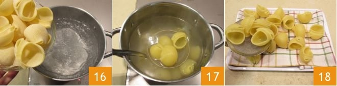 Leve ao ponto de fervura uma panela com bastante água salgada, adicione os lumaconi 16 e cozinhe por 10 minutos (ou pelo tempo indicado na embalagem), tendo o cuidado de deixá-los al dente 17. Transfira os lumaconi para uma bandeja forrada com um pano de prato e deixe secar e esfriar um pouco para não se queimar ao recheá-los 18.