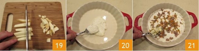 Por último, corte também a scamorza em cubos 19. Agora você pode montar a preparação: pegue uma forma de 27 cm de diâmetro, espalhe uma camada de molho bechamel no fundo 20, depois distribua uma camada de ragu e tempere com alguns cubos de scamorza 21.