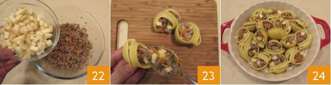 Em uma tigela, misture o ragu com os cubos de scamorza restantes 22, depois, com a ajuda de uma colher, recheie os lumaconi com o ragu 23 e coloque-os na forma, lado a lado 24.