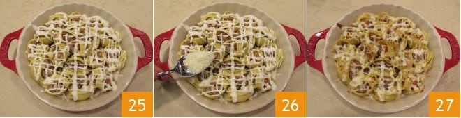 Depois de terminar, tempere os lumaconi com o molho bechamel restante 25 e com o Grana ralado 26. Gratine sob a grelha por 5 minutos, depois retire do forno 27 e deixe esfriar um pouco antes de servir.