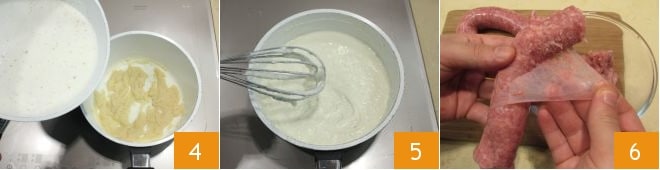 Coloque novamente no fogo baixo e mexa até ficar dourado: desta forma, você obterá o roux. Aromatize o leite com noz-moscada e uma pitada de sal, depois adicione-o aos poucos ao roux 4, mexendo energicamente com o batedor para não formar grumos. Cozinhe por 5-6 minutos em fogo baixo até que o molho tenha engrossado 5, desligue o fogo e reserve. Cuide do ragu: retire a pele que envolve a linguiça 6 e reserve a carne.