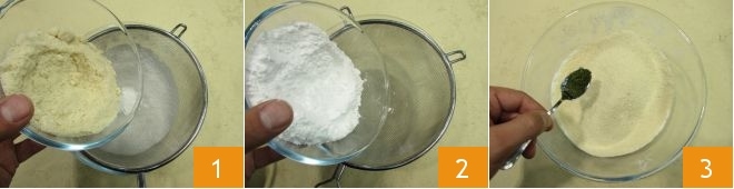 Para preparar os macarons salgados com salmão e endro, comece pela preparação dos macarons. Peneire em uma tigela a farinha de amêndoas 1 e o açúcar de confeiteiro 2. Adicione à tigela o sal e o endro seco 3.