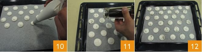 Transfira o composto para um saco de confeitar com bico liso de 12 mm. Em uma assadeira forrada com papel manteiga, crie, com o saco de confeitar, pequenos discos de massa com 3 cm de diâmetro 10, bem espaçados entre si por pelo menos 2-3 cm: com nossas quantidades, você obterá cerca de 60. Em seguida, pegue a assadeira com ambas as mãos e bata levemente no balcão (ou bata levemente com a mão no fundo da assadeira) para achatar levemente os macarons. Depois, polvilhe os discos com pimenta preta moída 11 e deixe-os secar por pelo menos 20 minutos à temperatura ambiente. Em seguida, asse em forno ventilado pré-aquecido a 145°C por 25-30 minutos (recomenda-se não usar o forno em modo estático). Retire do forno e deixe esfriar 12.