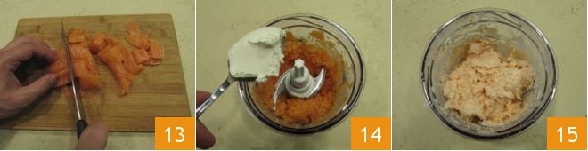 Enquanto isso, prossiga com a preparação do recheio dos macarons. Pegue o filé de salmão defumado e corte-o grosseiramente 13. Transfira para um processador de alimentos e adicione o queijo robiola 14, ajuste o sal e a pimenta e bata até obter uma espuma densa e sem grumos 15. Transfira para uma tigela.