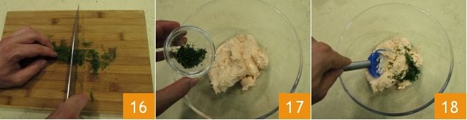 Depois, pique finamente o endro fresco 16 e adicione-o à espuma de salmão e robiola 17. Misture bem os ingredientes para amalgamá-los 18.