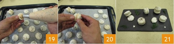 Finalmente, transfira a espuma de salmão para um saco de confeitar, pegue um disco e recheie-o com a espuma até cobrir toda a superfície plana 19; feche com outro disco, exercendo uma leve pressão com os dedos para que as duas extremidades adiram à espuma permanecendo unidas 20. Continue até terminar os ingredientes e você obterá 30 macarons. Seus macarons salgados com salmão e endro estão prontos para serem servidos 21!