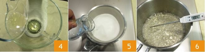 Em seguida, separe as claras das gemas e coloque as claras em uma batedeira. Comece a batê-las em velocidade média 4. Depois, pegue uma panela de bordas altas e coloque o açúcar cristal e a água 5 e deixe derreter em fogo baixo. Quando a calda atingir 116° (você pode medir com um termômetro de cozinha) 6,