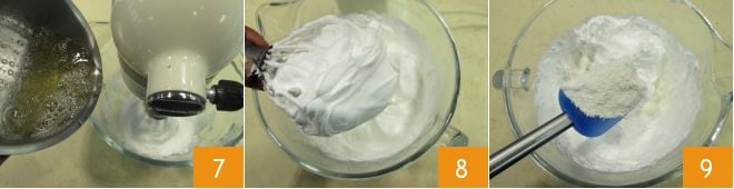 adicione-a lentamente às claras, que estarão brancas e espumosas 7. Continue batendo as claras até que o composto esfrie e as claras estejam em neve firme 8. Neste ponto, com uma espátula, incorpore os ingredientes secos às claras, procedendo com um movimento delicado de baixo para cima para misturá-los ao composto e evitar que as claras desmanchem 9.