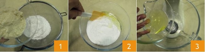 Para preparar os macarons caprese comece pelas conchas de merengue. Com uma peneira fina colocada sobre uma tigela, peneire o açúcar de confeiteiro e a farinha de amêndoas 1. Em seguida, adicione 75 g de claras 2 e misture bem os ingredientes com uma espátula até obter uma mistura homogênea. Reserve a mistura. Agora pegue uma batedeira e despeje os restantes 75 g de claras 3.
