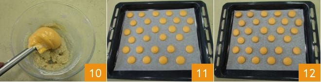 Finalmente, adicione o merengue colorido à primeira mistura com farinha de amêndoas, claras e açúcar de confeiteiro 10. Ajude-se com uma espátula e faça um movimento delicado de baixo para cima para não desmontar as claras. Transfira a mistura para um saco de confeitar com bico liso de 10 mm e crie pequenos discos com diâmetro de 2 cm em uma assadeira forrada com papel manteiga, espaçando os discos pelo menos 2-3 cm entre eles 11: com nossas doses, você deve obter cerca de 70 conchas. Para achatar levemente as conchas dos macarons, bata levemente com a palma da mão no fundo da assadeira ou toque-a suavemente na bancada de trabalho. Asse em forno ventilado a 160º por 12-13 minutos (não é aconselhável usar o forno em modo estático). Após o cozimento, retire a assadeira, deixando esfriar em temperatura ambiente 12.